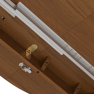 Tabletop set atop steel runners; simply unlock the latches and pull both sides apart