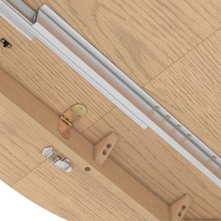 Tabletop set atop steel runners; simply unlock the latches and pull both sides apart