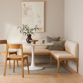 This word gets thrown around a lot these days, but in this case, "iconic" is appropriate. The Cozy Corner Bundle features our Hendrick table, which showcases the signature swoops of the Atomic "Tulip" design, now updated with contemporary wood finishes. Paired with the strong, solid Munk chair, this bundle is distinguished by a round tuffet featuring velvet and foam filling. A slightly curved backrest makes it restful to relax at the Hendrick table of the Cozy Corner Bundle.