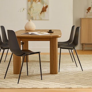 Minimalism made easy. Combining the light, natural palette of our Seno Round Dining Table with the Svelti Dining Chairs, this Scandi-inspired bundle brings a real breath-of-fresh-air kind of design aesthetic to any lived space.