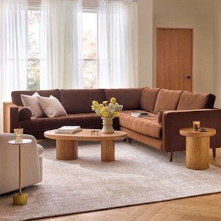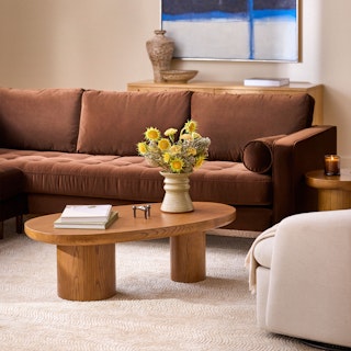 How does a person balance extravagance and practicality? With a velvet sectional sofa, obviously. With lux brushed velvet, loose back cushions and bolsters, and solid wood legs, there’s a reason this is our most popular sofa. A corner blocked wooden frame and slim walnut legs make for a sturdy and stylish movie-watching companion — pair with a smattering of tropical plants and coffee in a pretty mug.
